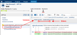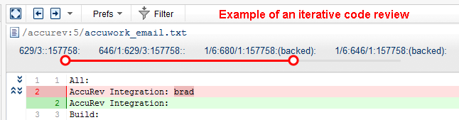 As in the AccuRev Diff tool, text is color-coded -- red to indicate text that has been removed from a version, green for text that has been added to a version. Sliders let you collapse the display to show only the contents of given version.
