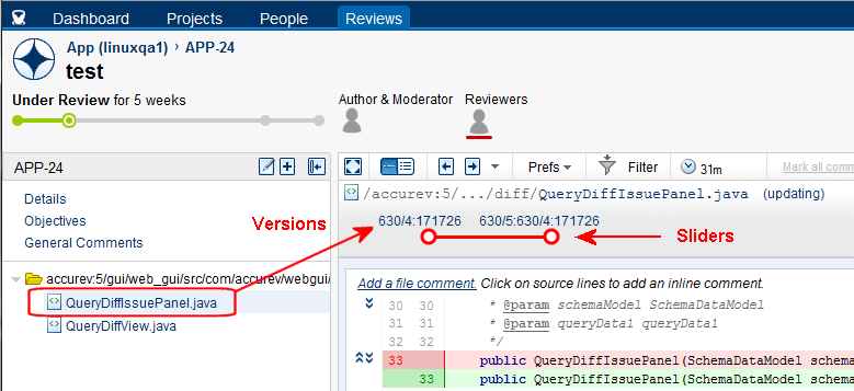 When you submit an element to code review, AccuRev performs a diff operation to allow reviewers to compare versions of that element. As shown in the following illustration, versions used for the diff operation are displayed at the top of the Reviews tab, directly under the file name. Each version is displayed with its stream and version number -- in this example, 630/4 for the basis version and 630/5 for the head. Both versions display the AccuRev element ID (eid) -- in this example, 17726.