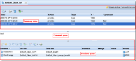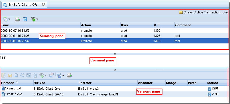 AccuRev displays the results of this command in the Stream Transactions tab, which consists of three panes—Summary, Comment, and Versions—as shown in the following illustration:
