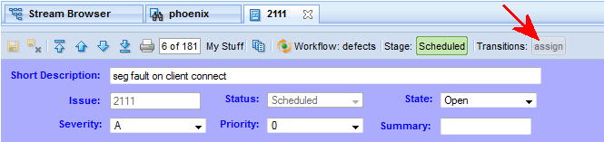 When you do, fields in the issue record are updated based either on the actions specified for the transition or for its new stage, if any. In addition, promoting an issue from one stream to another can cause a workflow transition to be executed depending on the workflow rules your AccuRev administrator has established for the streams in your depot. Examples of the types of changes you might encounter on the Issue Edit form include:
