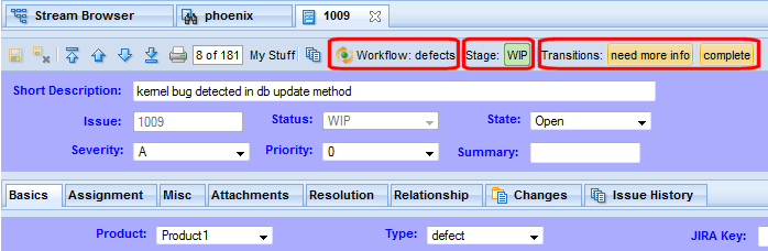 The specific buttons that appear are based on the conditions that have been defined for the workflow, and on the logic that has been defined for individual workflow stages and transitions. The issue in this example is subject to the defects workflow. It is currently in the WIP workflow stage, from which two transitions are available: need more info and complete.