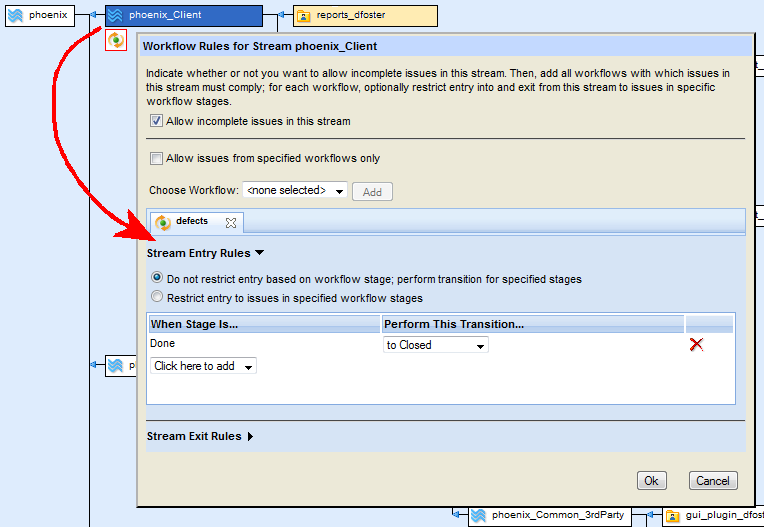 If workflow rules have been set for a stream in your depot, AccuRev displays a workflow icon, like the one on the phoenix_Client stream shown here: