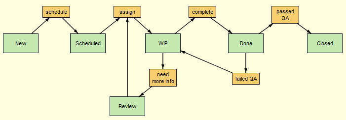 In this workflow, when a developer finishes work on an issue, she can move the issue from the WIP stage to the Done stage using the complete transition. If she needs more information from, say, the product owner before she can begin work on the issue, she can use the need more info transition to move the issue to the Review stage, reassigning the issue to the product owner in the process.