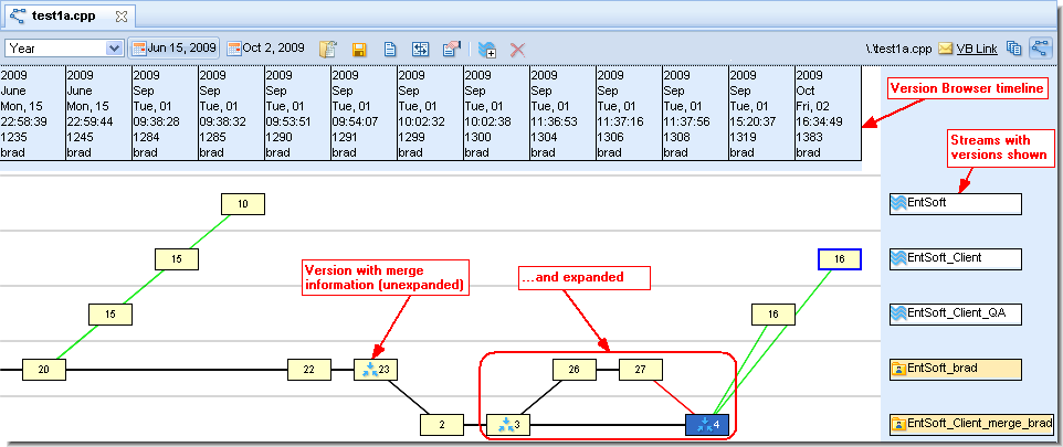 - Versions belonging to a particular stream are shown horizontally aligned with that stream.