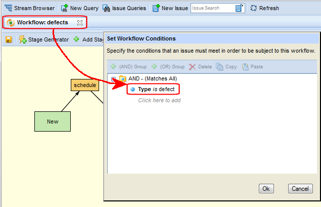 - Set workflow rules that restrict entry into and/or exit from a stream to issues in a given workflow stage. For example, you might want to restrict entry into your build stream to those issues whose status is Closed.