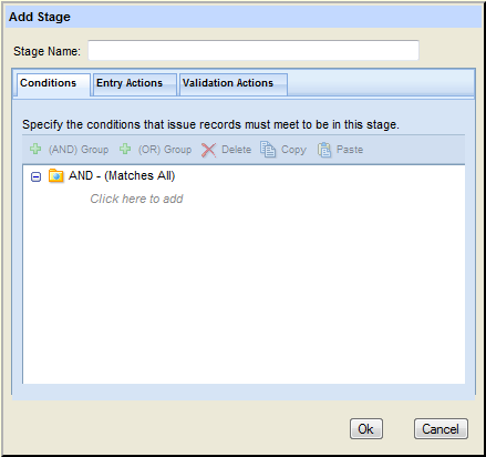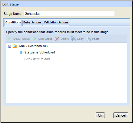 Conditions. Each stage must be defined with one or more conditions; conditions act as a filter that determines whether or not an issue can be in that stage. For example, the condition for a Scheduled stage might be as simple as Status = Scheduled. Only issues that satisfy that condition—in other words, only issue records whose Status field is set to Scheduled—can be in the stage.
