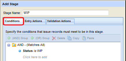 As shown in the following illustration of the Conditions Editor on the Edit Stage dialog box, this condition ensures that only issue records whose Status field is set to WIP can be in this stage: