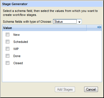 Use the Stage Generator to have AccuRev automatically create one or more fully defined workflow stages and their associated transitions based on values in your AccuWork schema. Only schema fields with the type Choose are used by the Stage Generator. Examples of schema fields of type Choose you might consider using to create workflow stages include Status and State.