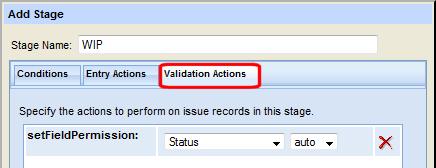 Validation actions – Unlike entry actions, which are performed only when an issue enters a stage by transition, validation actions are performed when an issue record is opened. Validation actions are typically used to identify required fields or fields that you want to make read-only. For example, the setFieldPermission validation action sets the corresponding field to auto, which is a special type of read-only that allows only AccuRev to modify the field.