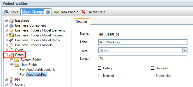 You must add the AccuWork fields to your OpenText Application Quality Management projects as user-defined fields. You can do this using the Project Customization.