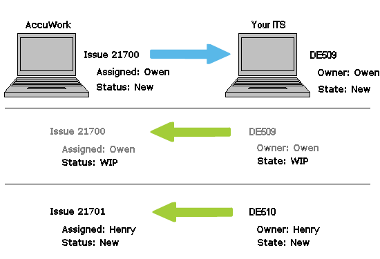 In this example, a new issue, 21700, is created and assigned to Owen in AccuWork. AccuSync automatically creates this issue as defect DE509. When the State of defect DE509 is changed from New to WIP in your ITS, AccuSync automatically synchronizes the changed value with the Status field in the corresponding AccuWork issue. Finally, an ITS user creates a new defect, DE510. This new issue is automatically created as issue 21701 in AccuWork.