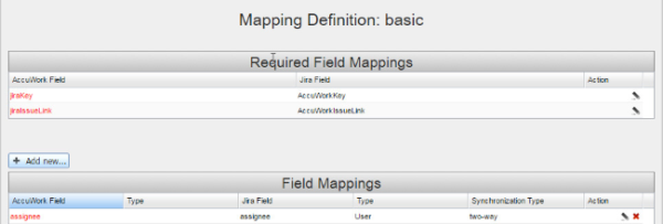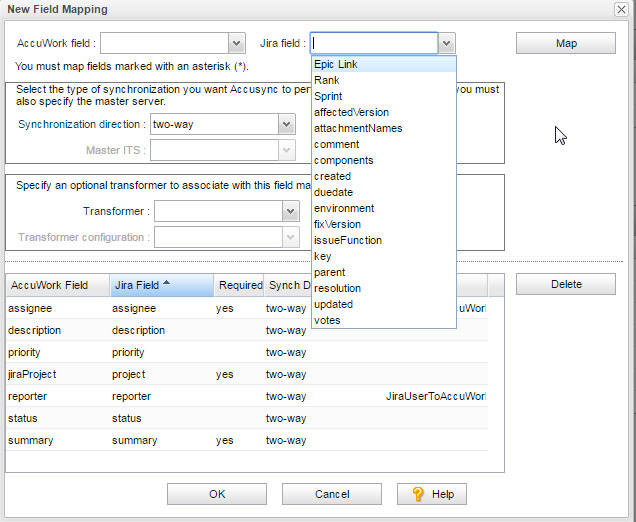 AccuWork Field Select existing AccuWork field from the list or enter a new field name, which is to be mapped to the JIRA field. JIRA Field Select the JIRA field from the list to which the AccuWork field is to be mapped. Synchronization Direction Select one way or synchronization from the list. Master ITS Select the appropriate Issue Tracking System, for example: JIRA. Transformer Leave this field blank. Transformer Configuration Leave this field blank. -