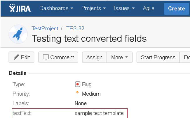 Navigate to Create button on the JIRA window to check if the scripted field is displayed. For example, testText sample texttemplate is displayed under the section Details.