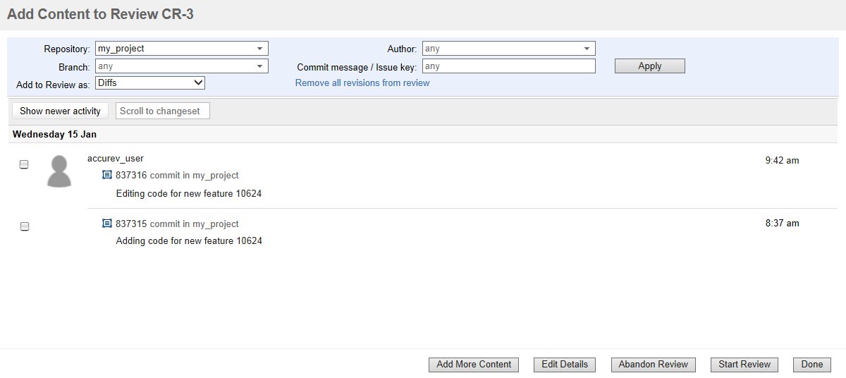 to add content from an AccuRev repository.The Add Content to Review window appears.