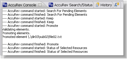 Some commands (for example, Team > ) both write to the AccuRev Console view and write to another view in the AccuRev perspective (in this example, the History view).
