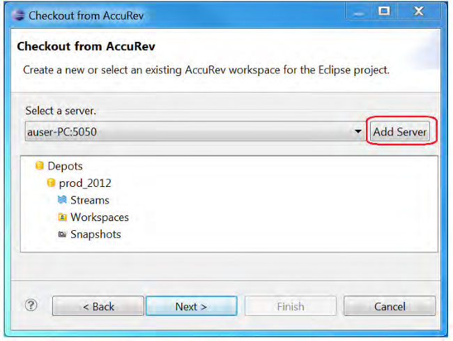 In the AccuRev Plug-In for Eclipse, you are asked to select the AccuRev Server where your AccuRev files are stored. If your AccuRev Server does not appear as a choice, you can add the server using this procedure.