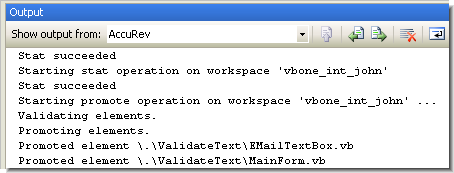 Messages generated by AccuRev commands are directed to the AccuRev pane of Visual Studio’s Output window.