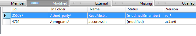 When you select one of these buttons, the AccuRev Workspace Explorer displays the elements with that AccuRev status in the current workspace. The following example shows the files in the workspace with a Modified status: