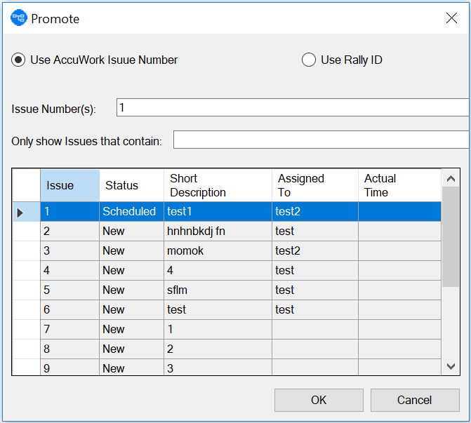 You must select one or more of these issue records by point-and-click, or by typing in the Issue Number(s) input field. Use SPACE characters to separate multiple issue numbers. When you click OK, the versions being promoted are added to the change packages of the selected issue record(s).