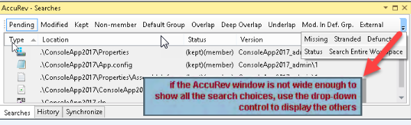 In the Searches tab, you can search for items based on their AccuRev status, and execute commands on search results items.