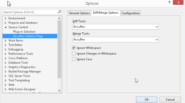 Use the Tools > Options command to display the Options dialog. Then choose Source Control > AccuRev Options Page from the tree of option types. (If this page does not appear in the tree, select the Show all settings check box at the bottom of the dialog.) You can set user preferences for AccuRev’s Diff/ Merge functionality, as well as more general options.