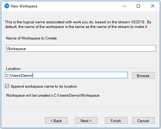 If you want AccuRev Plug-In for Visual Studio PE to create the workspace using standard settings for contents, type, and end-of-line characters (EOL), click Finish. You are done. The new AccuRev workspace is ready for use. Otherwise, click Next.