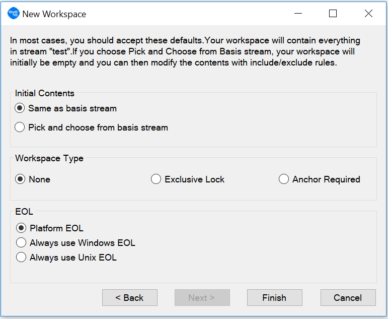 - In the Initial Contents field, select Pick and choose from Basis stream if you want to add only specific directories from the basis stream to your new workspace. In the Workspace Type field, optionally specify whether you want to create the workspace with locking restrictions or anchoring requirements. If you choose either of these options, you will need to perform an Anchor command on a file before editing it. In the EOL field, specify the type of End of Line (EOL) symbol you want to use.