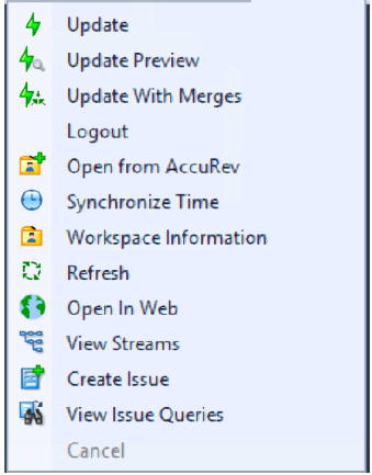 | Update Preview | Lists the changes that would be made by an actual workspace update in the Output window’s AccuRev pane. |