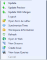 | Update | Performs an AccuRev Update command on all workspaces that contain projects in the current solution. An update copies versions into your workspace from your workspace’s backing stream. This has the effect of incorporating other people's changes, which they have promoted to the backing stream, into your workspace. |