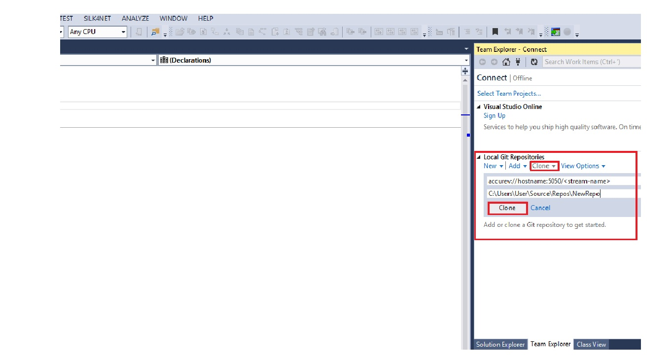 1. Launch Visual Studio and navigate to View > Team Explorer. In Local Git repositories, click the Clone option.
