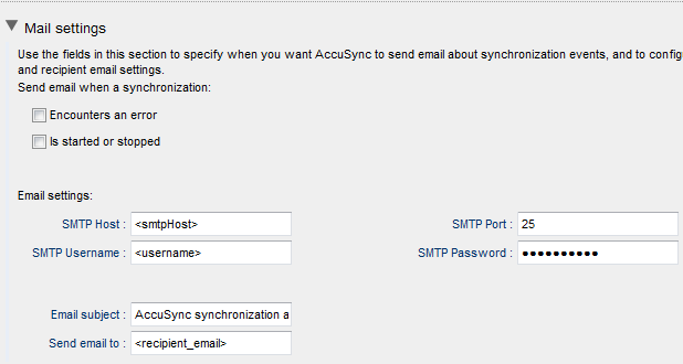 - The value in the Email subject field is used for all AccuSync email notifications, regardless of their type. Change the default value (AccuSync synchronization alert) as needed.