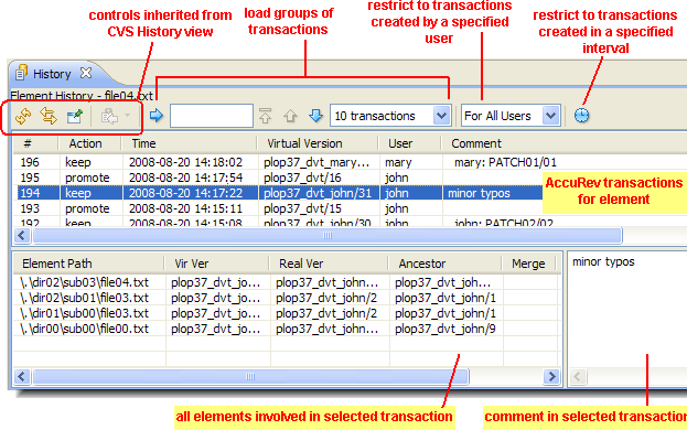 You can manipulate the table in the usual way see Working with the Results Table in AccuRev Search/Status View . This view is a variant of the CVS History View, and so inherits some of its controls: