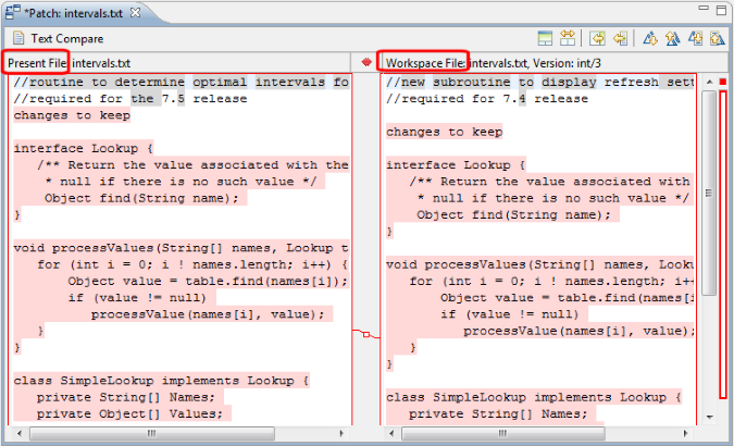 3. Right-click the transaction and choose Patch From from the context menu. The Eclipse Compare editor appears. The Present File pane displays the version of the file in your Eclipse project. The Workspace file pane displays the version whose changes you want to patch into that file.