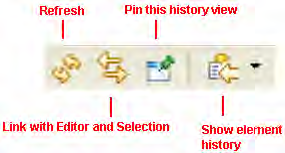 Link with Editor and Selection A toggle switch. When linking is enabled, selecting an element in the Package Explorer/Navigator or switching to an element’s Editor tab automatically displays the element’s history. Up to 15 of these histories are cached in the History view. You can redisplay a cached element history with the Show element history toolbar button.