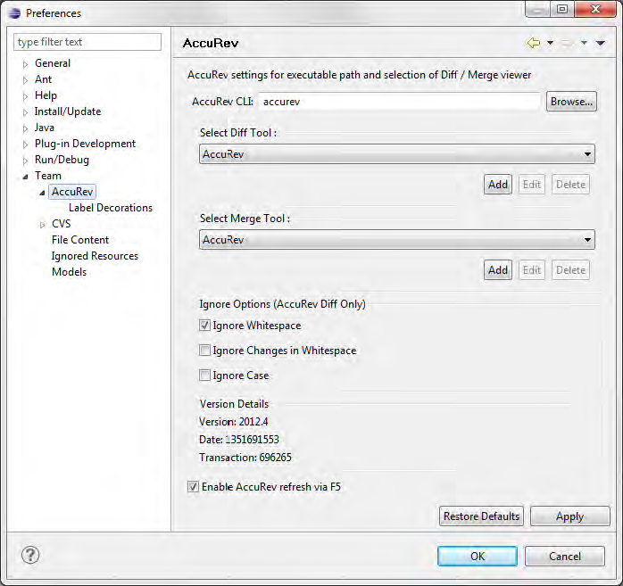 Display the AccuRev page on the Eclipse Preference window by selecting Window > Preferences >Team > AccuRev from the Eclipse menu.