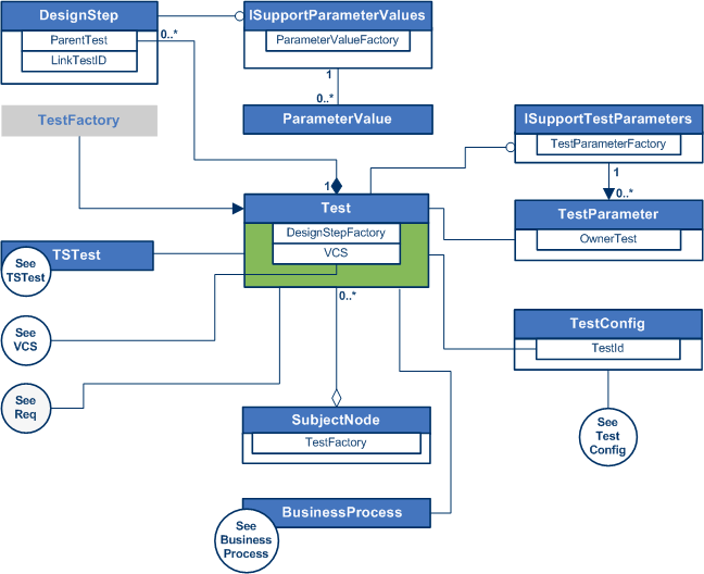 Tests can have subunits called DesignSteps. DesignSteps can have values for parameters. A DesignStep can include a call to another Test. The Test to be called is identified with the LinkTestID.