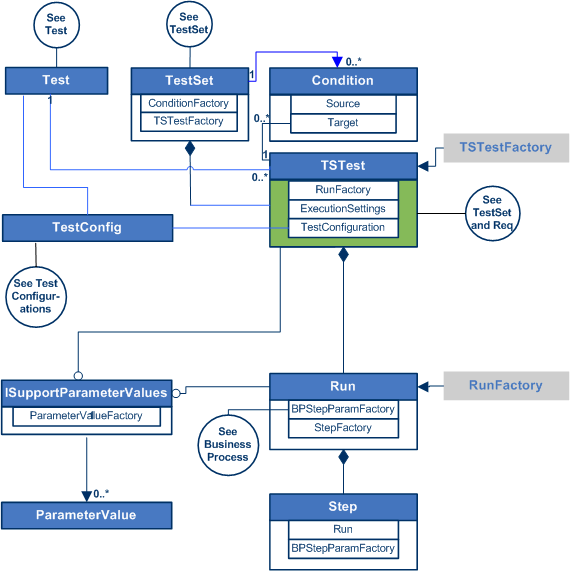 There can be Conditions that must be met before a test instance is run. The conditions for the TSTests are managed by the TestSet's ConditionFactory. The Condition.Source is the condition that must be met, such as the successful completion of a previous TSTest run. The Condition.Target is the TSTest that is run when the condition is met.