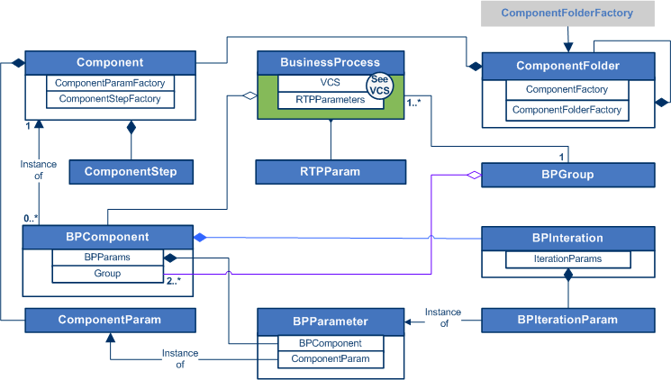 Each instance of a Component in the BusinessProcess is a BPComponent. When a BPComponent is created by adding aComponent to a BusinessProcess several objects are created automatically: A BPIteration is created, and for each ComponentParam, an instance called a BPParameter is created. Your code can add iterations and parameters.