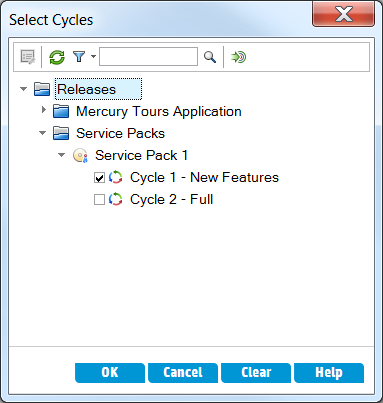 Choose Requirements > Assign to Cycle. In the Select Cycles dialog box, locate the Service Packs releases folder. Under Service Pack 1, select the check box for the Cycle 1 - New Features cycle. Click OK.