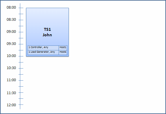 John submits the request. The system allocates Host1 as the Controller, leaving Host2 available to serve as either load generator or Controller in other timeslots. Additionally, the system allocates Host4 as the load generator, since it has higher priority than both Host2 and Host3. The following hosts are allocated successfully: