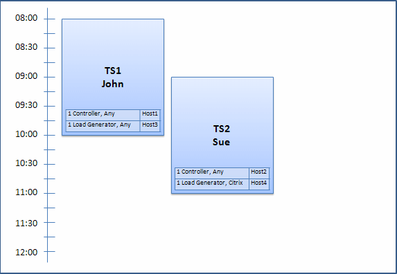 Because Host4 is the only Citrix load generator, the system checks if it can allocate a different load generator to John's timeslot so that Host4 can be allocated to Sue's timeslot instead.