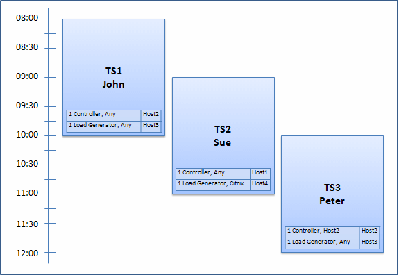 There are many factors that can affect the allocation of hosts among timeslots. Consider the following scenarios which illustrate how hosts are allocated among performance timeslots and how changes in the available testing hosts can affect the host allocation. You will see that Lab Management attempts to optimize the overall resource usage by reshuffling the hosts that are available among the timeslots.