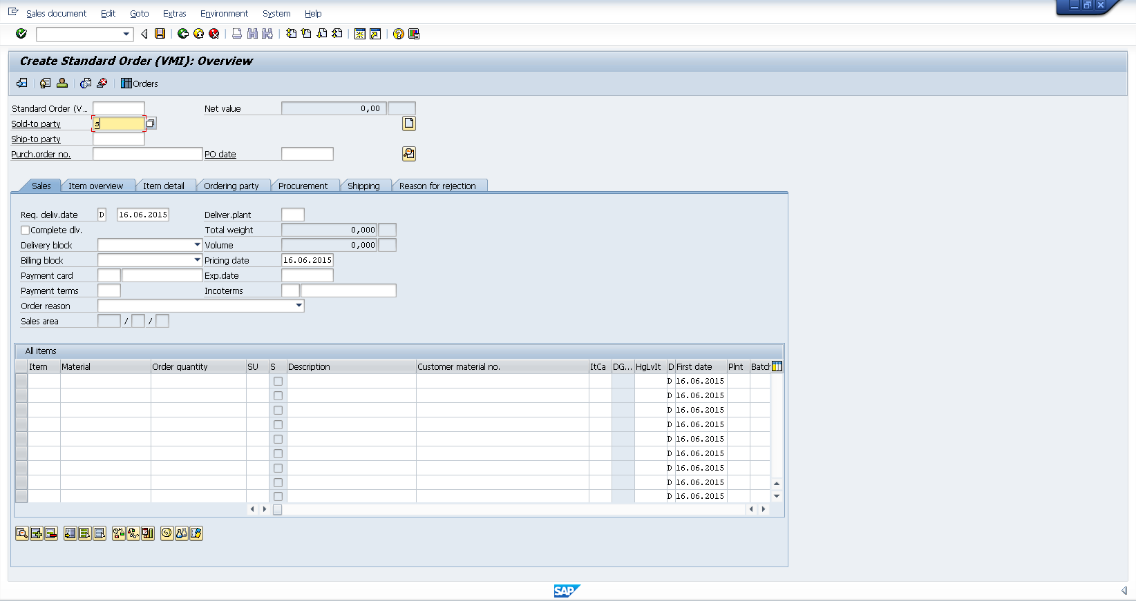 When you learn a flow or business process test, containing this screen, operations performed on the upper area of the screen containing the menus, toolbars, and common fields (such as Standard Order and Net value) comprise a single business component. Operations performed in each of the Sales, Item overview, Item detail, Ordering party, Procurement, Shipping, and Reason for rejection tabs result in the creation of separate business components.