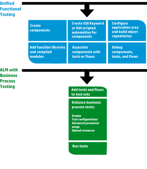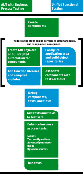 The following is an example of a common Business Process Testing workflow using OpenText Functional Testing (OpenText Functional Testing). This example demonstrates one possible method for working with components and keyword GUI steps.