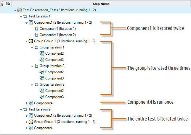 For example, consider a business process test that contains four business components; Component1 (C1), Component2 (C2), Component3 (C3), and Component4 (C4). The test requires that components C2 and C3 be grouped and that the components and group are then run and iterated as follows: