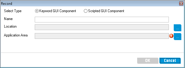 Enter the type of automated component to record (keyword GUI or scripted), the name of the component to record, the location, and the application area. Click OK. The Recording toolbar opens.