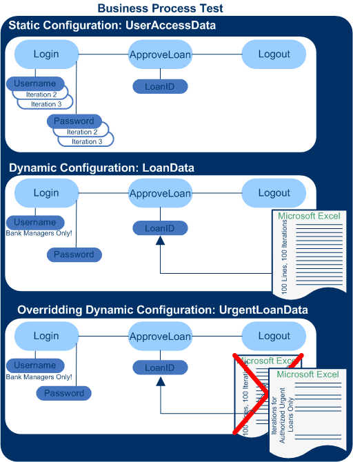 A configuration named LoanData accesses dynamic data for one hundred different values for the LoanID input parameters used by the ApproveLoan component. These values are provided in a Microsoft Excel test resource of the data table type. A test iteration is run for each value in the Microsoft Excel file, so the test instance that uses this configuration runs one hundred times.