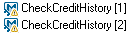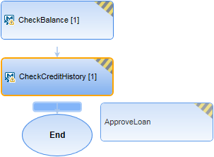 Drop indicator. When selecting an entity from the Select Components and Flows pane into the canvas, or moving an entity within the canvas, this indicator helps you position the entity. Example: The ApproveLoan component is being pasted after the CheckCreditHistory component.