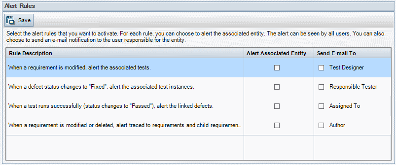 You can keep track of your requirements, tests, and defects as you perform your application management process. When an entity changes, you can notify the responsible users for any associated entities.