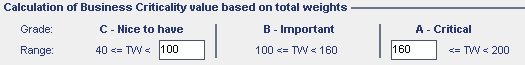 Under Calculation of Business Criticality value based on total weights, define the boundaries between different Business Criticality values. To define these boundaries, type the relevant values in the Nice to Have and Critical fields.